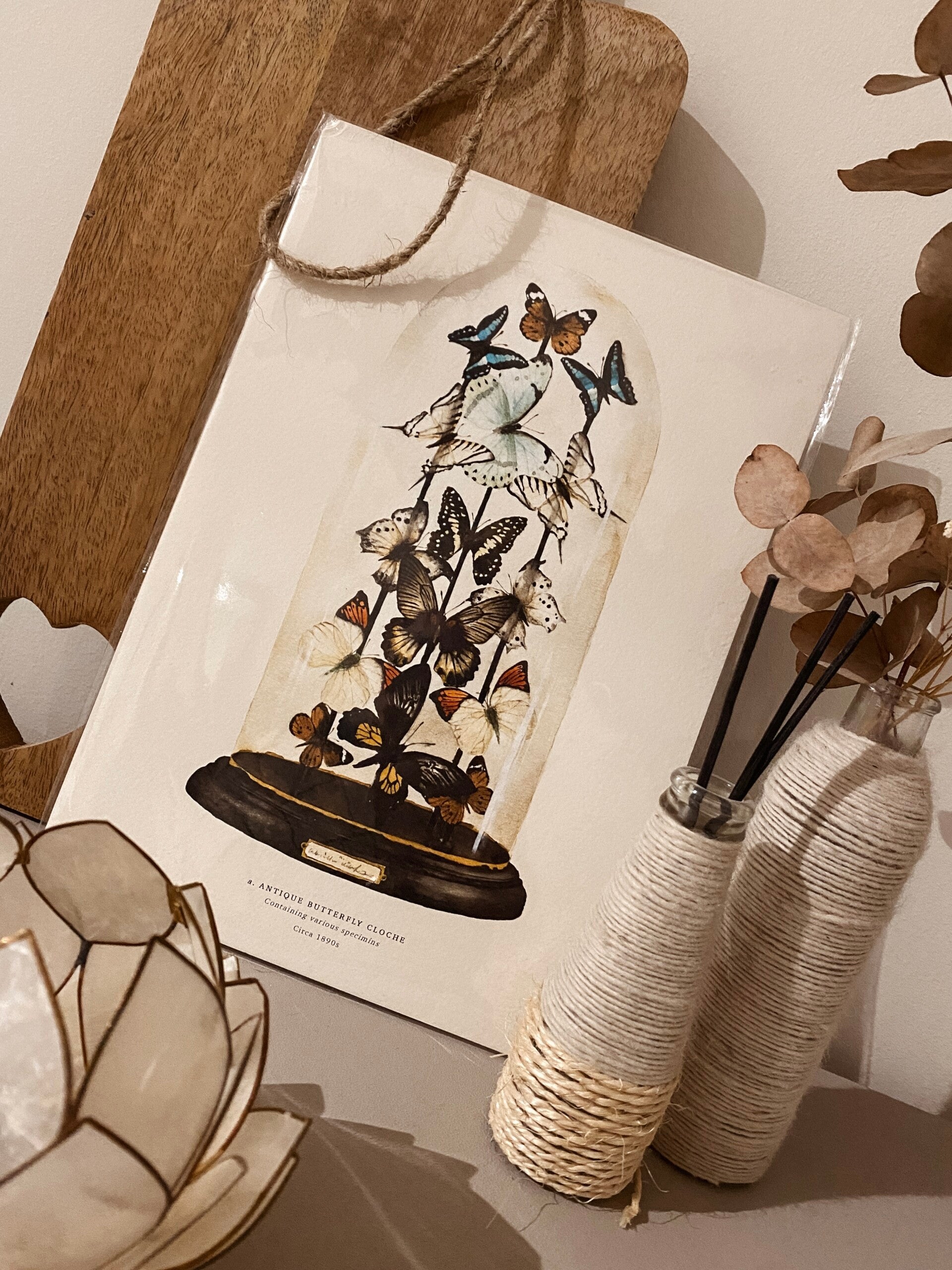 A4 Print - Aquarel illustratie van een antieke glazen vlinderstolp met diverse soorten vlinders.
