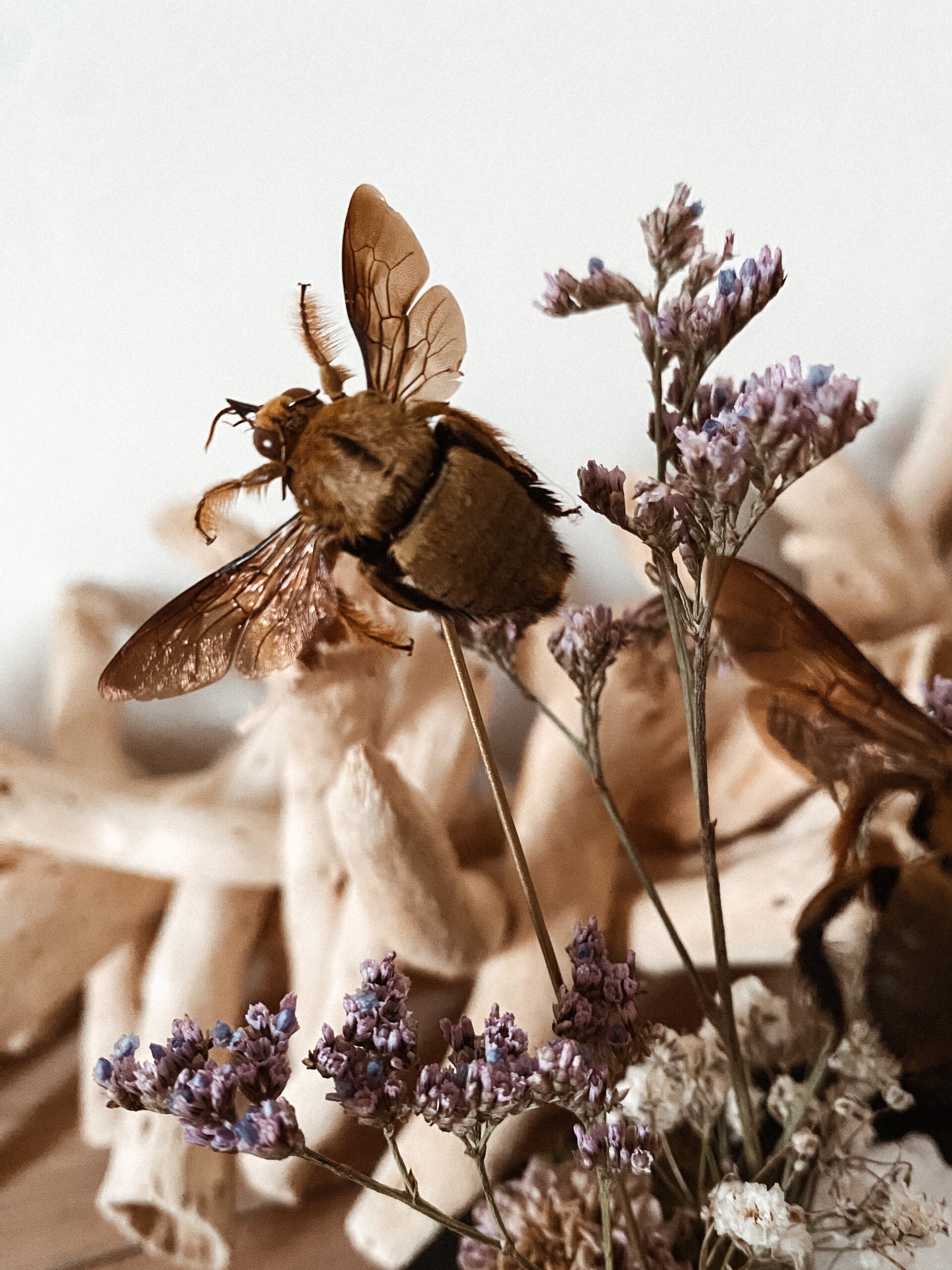 Twee gouden bijtjes, bevroren in de tijd. Dragers van zachtheid, rust en zachte magie die je uitnodigen tot een moment van verstilling.
