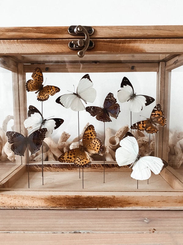 Een verzameling vlinders samengebracht in één zachte compositie, een evenwicht van rust en verfijning. Een ware harmonie van kleuren en soorten.
