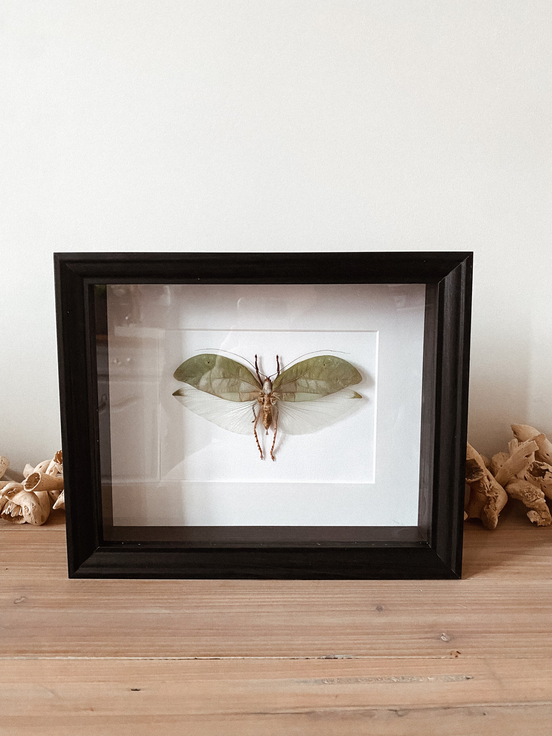 Met wit- en groentinten, magisch gecamoufleerd als blaadjes, lijkt deze sprinkhaan moeiteloos te verdwijnen. Een krachtige subtiele verschijning met een tijdloos karakter.
