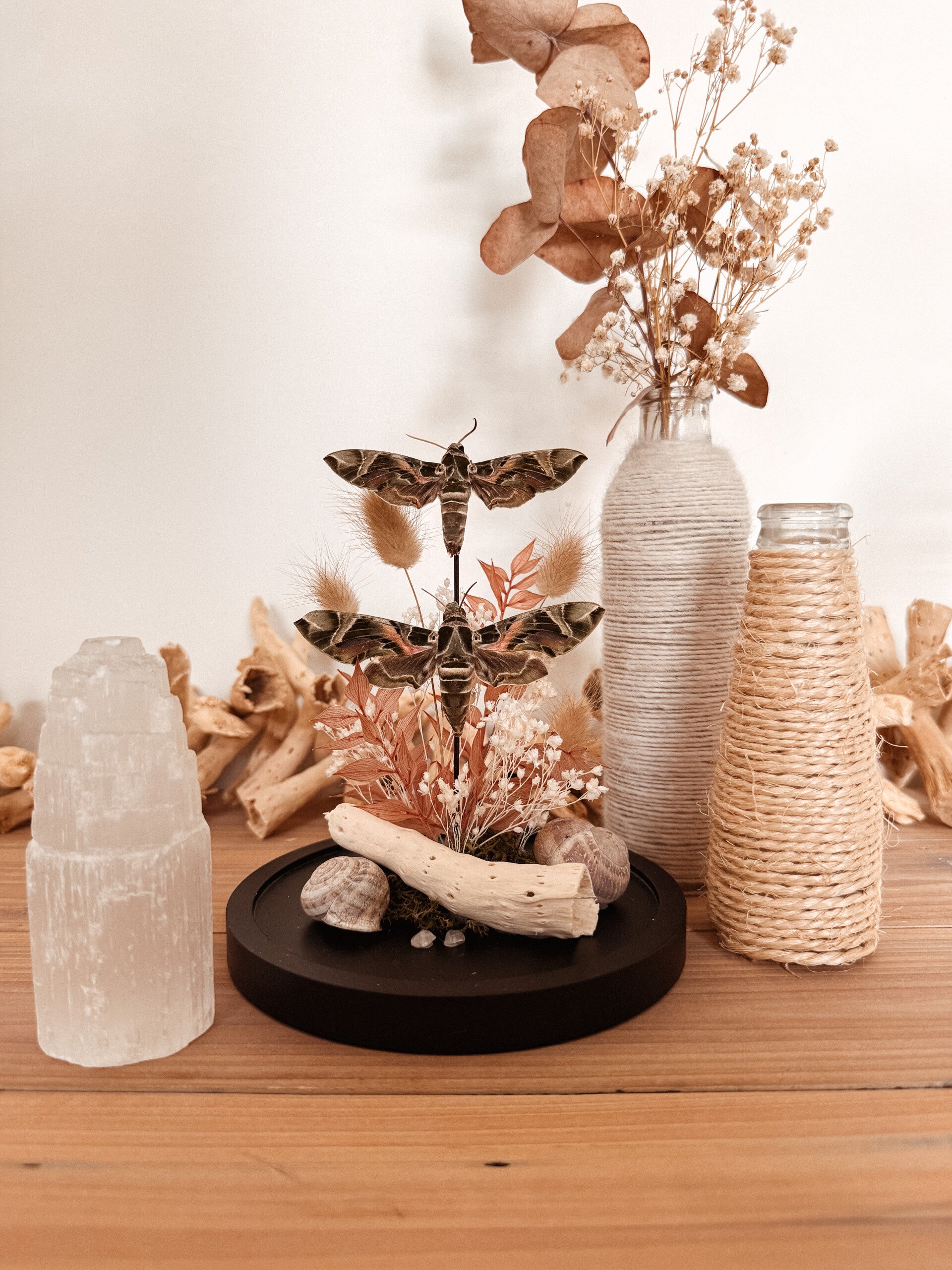 Een elegant duo Oleander-pijlstaartvlinders, omringd door zachte droogbloemen en kleine Franse slakkenhuisjes ontstaat er een natuurlijk tafereel vol rust en verfijning.